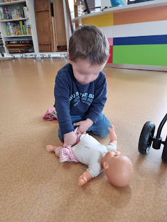 Bastien joue au papa,......Apolline explore activement.